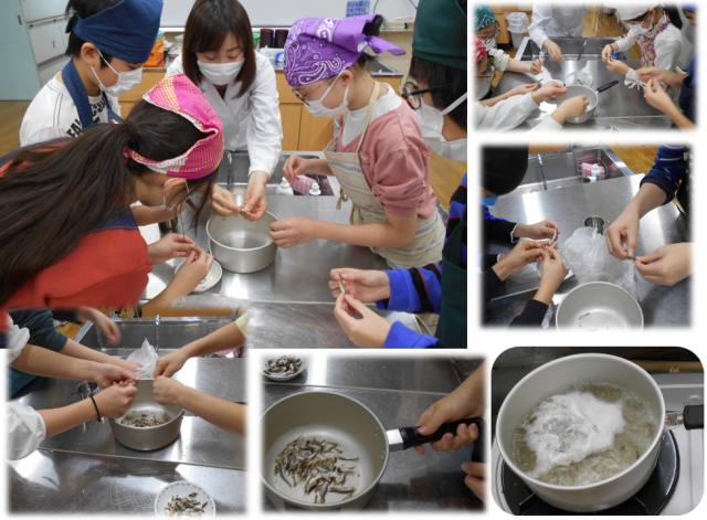 授業は煮干しを使った本格的な出しの取り方からスタートしました。苦味の出る頭と内臓を取り除いて、中火のお湯で煮だすと「だしのいい匂いがする!」と子どもたちの嬉しそうな声が聞こえてきました。