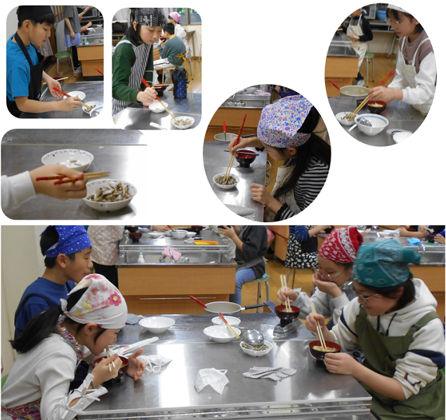 試食は黙食モードで行われました。皆おいしそうに食べて、お代わりもしていました。だしを取った後の煮干しも「おいしい」と食べる子が続出。「日本の味」とその作り方がしっかりと伝わったようです。