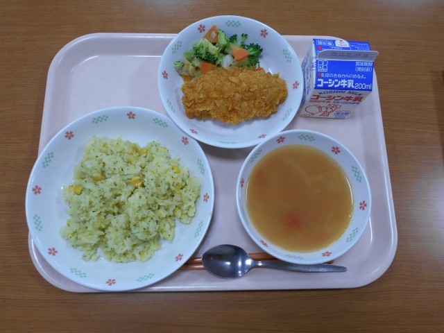 牛乳、きびコーンライス、クリスピーチキン、ブロッコリーソテー、ABCパスタスープ