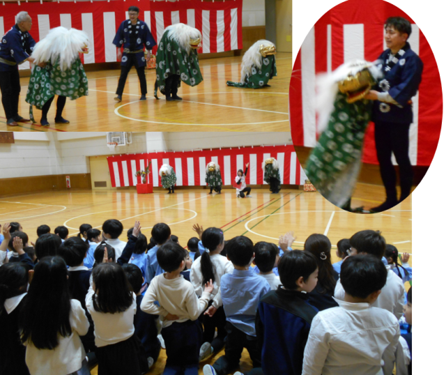 素晴らしい獅子舞を披露してくださった東囃子の皆さんと見学を呼び掛けてくださった幼稚園のおかげで、千代田小の子どもたちもお正月の習慣・風習を身近に感じることができました。