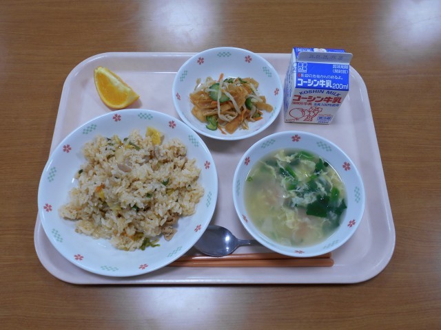 牛乳、キムチチャーハン、パリパリワンタンサラダ、卵スープ、ネーブル