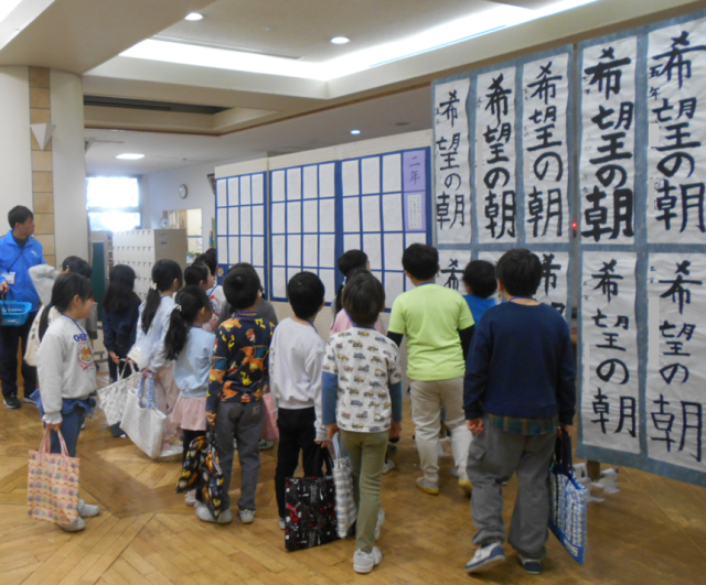 1月19日(月)から24日(土)まで1階の多目的ホールで書初め展が開かれています。昨年12月から学年ごとの課題を練習し始め、新年に席書き会で清書した子どもたちの書写作品が一堂に会して見事です。