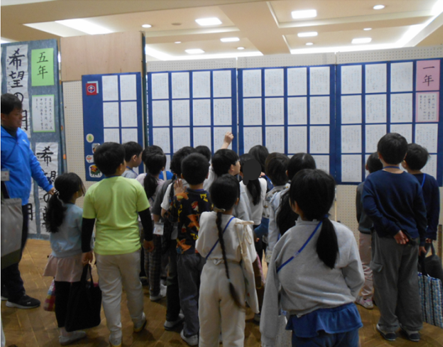 1月22日(木)には1年2組の子どもたちが先生と一緒に鑑賞。難しい漢字の使われている上級生の作品を見る時は先生が音読していました。「すごいね。難しい漢字も使われているけど、みんなも将来こういう作品が書けるようになるよ」と言うと、子どもたちは嬉しそうにうなずいていました。