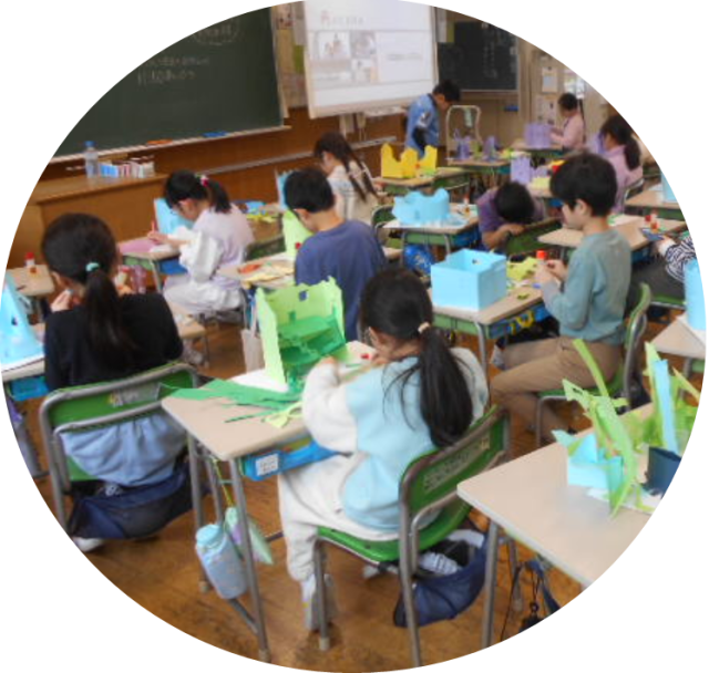 1月28日(水)、2年2組の図工では色画用紙を使って、窓のある建物の制作をしました。初めて使い方を学習したカッターで色画用紙から窓部分を切り抜き、画用紙を丸めて塔のようにしたり、四角く折ったりして建物を作っていきました。窓の形や設置場所、屋根の形も独創性に溢れています。窓を目と口の形にカットして、全体でみると笑顔に見える建物もありました。