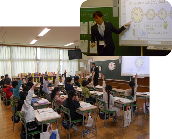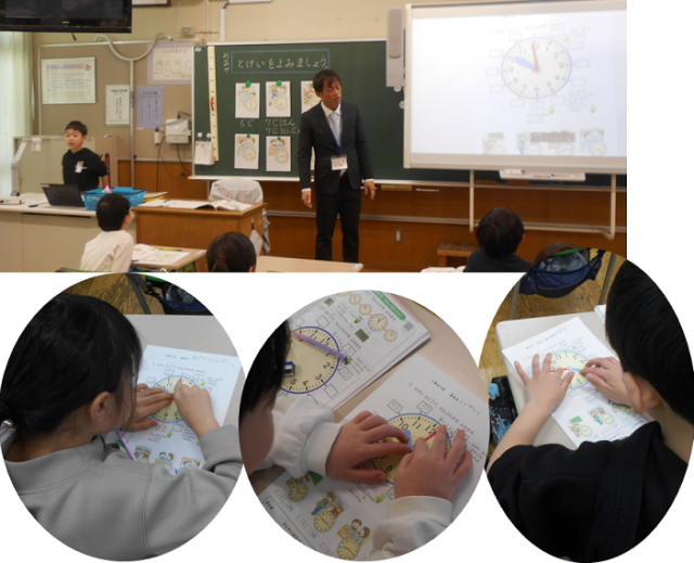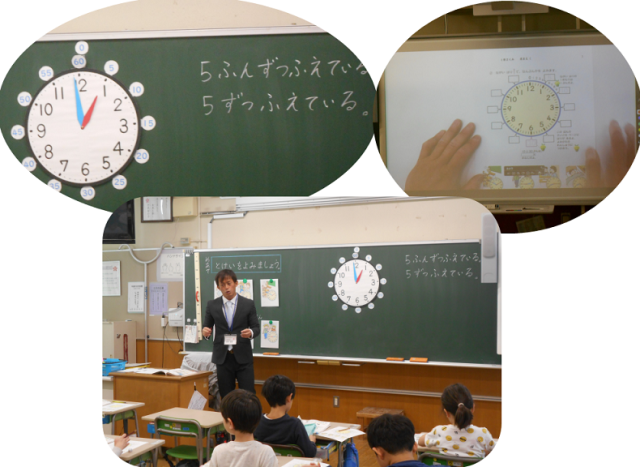 2月6日(金)、1年2組で算数の研究授業が行われました。「なんじなんぷん」の単元(全2回)の最初の授業で、「時計を見て、時刻を読み取ることができる」ことを目標に、生活の場面と結び付けながら時刻を読む練習をしました。