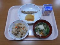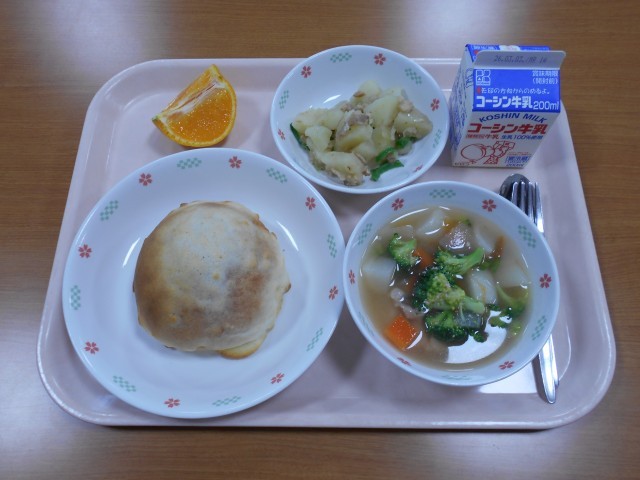 牛乳、おひさまパン、ジャーマンポテト、ゴロゴロ野菜スープ、不知火