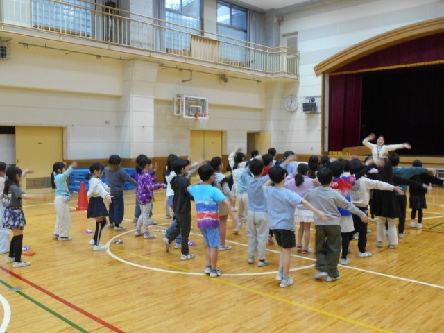 実際の会場で練習することで、演じる子ども同士や演じる子どもと鑑賞する子どもがぶつからないように間隔を調整したり、床の滑り具合を考慮して出し物の一部を変更したり、ダンスの振り付けの微調整などをしながら、音楽に合わせた通し練習もしました。