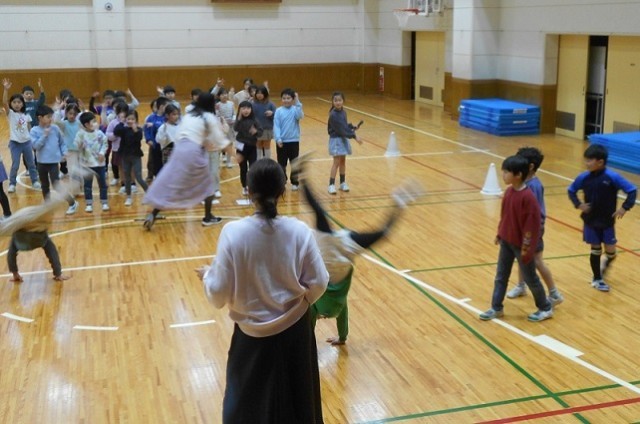 2年生は2月17日(火)と20日(金)に体育館で1組・2組合同の練習をしました。出し物は「倍々ファイト」。アップテンポな曲に合わせて、歌とダンス、縄跳びに側転まで次々に飛び出す内容です。