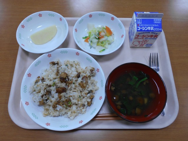 牛乳、さんまご飯、白菜のレモン和え、なめこ汁、りんご