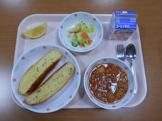牛乳、ガーリックトースト、ポークビーンズ、かぶのサラダ、はるか