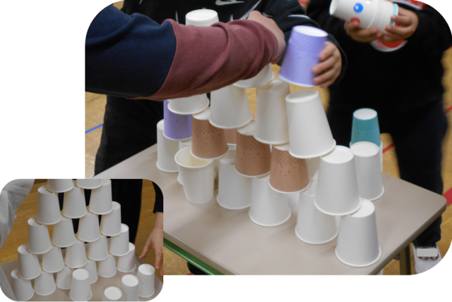少し緊張した発表の後には、交流ゲームで盛り上がりました。たくさんの紙コップを使い皆で「にこにこタワー」作りに挑戦。大人対子どもチームで対戦したり、ミックスチームで対戦したり、時間内に少しでも高いタワーを作ろうとチーム一丸となって取り組んで、笑顔に溢れたおわりの会となりました。