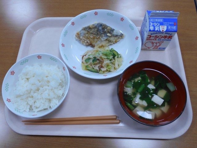 ご飯、鰆のから揚げレモンソースがけ、野菜とちくわの和え物、豆腐のすまし汁