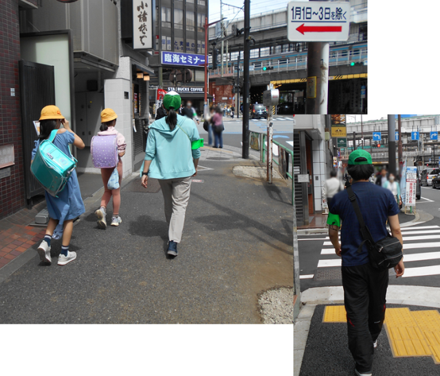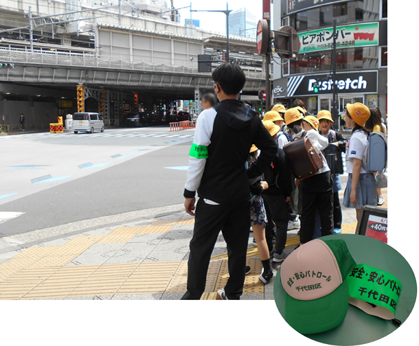 下校時刻になると、先生方は「千代田区 安全・安心パトロール」の緑の帽子・緑の腕章をつけて、自身が担当する下校ルートに向かいました。