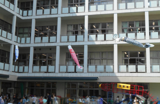 4月16日(木)、主事さんたちが校庭に鯉のぼりをあげてくれました。春風を受けて気持ちよさそうに泳いでいます。