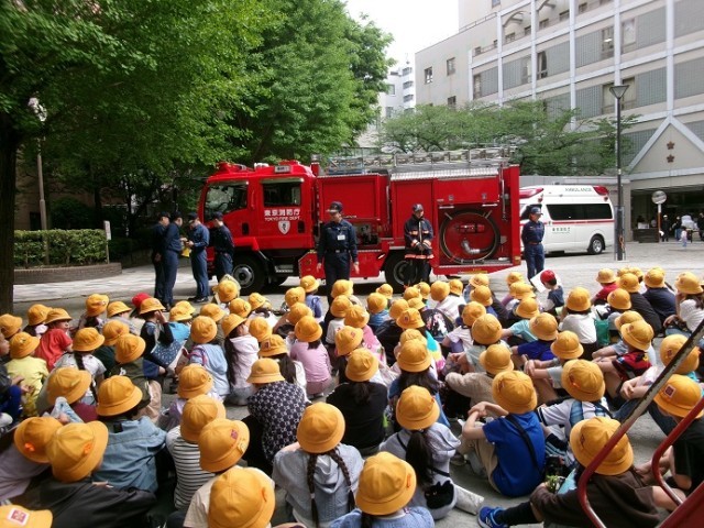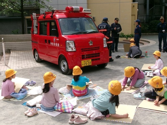 4月20日(月)、東京消防庁神田消防署のご協力で今年も消防車や救急車を間近に見ながら描く「働く消防の写生会」が開かれました。