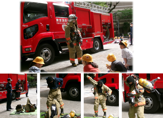 消防士の方が防火服に早着替えする様子(所要時間45秒ほど)も見せてくださり、緊急時に一刻も早く現場に到着できるように訓練を積んでいる様子を垣間見ることができました。
