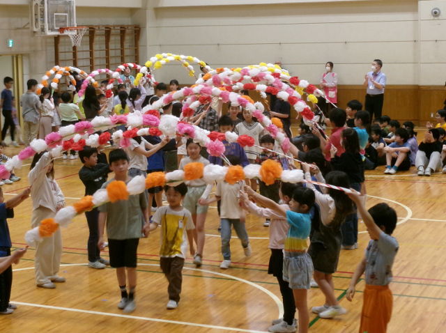 入学から2週間、小学校生活に少しずつ慣れてきた新1年生の子どもたちが、6年生と手をつないで花のアーチをくぐって入場です。