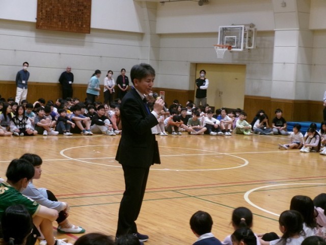 上級生に交じり、会場全体で校歌を歌った後は校長先生のお話でした。歌詞を見ながらとはいえ、1年生が校歌をりっぱに歌えたことに校長先生はとても驚いていました。入学式で校長先生がお話しした学校生活で大切にしてほしい二つ、「おはようございます」などの挨拶」と感謝「ありがとう」も、1年生の子たちはしっかりと覚えていてくれました。