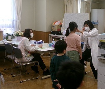 4月28日(火)に眼科健診が行われました。校医の先生が専用のライトで子どもたちの瞳を照らして、瞳孔の開き方などさまざまな角度から診てくださいました。