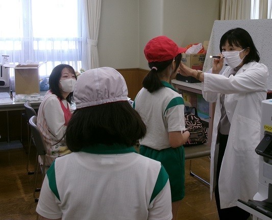 低学年の中には稀にライトをまぶしがる子どももいましたが、「目を少しパチパチしてみて」などと声掛けをして、開いた瞬間に診てくださったりしながら、子どもたち全員が無事に健診を終えることができました。