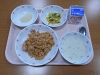 牛乳、キムチチャーハン、野菜揚げぎょうざ、青梗菜スープ、冷凍桃