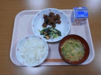 牛乳、ご飯、鰹のから揚げ薬味ソースがけ、野菜のうま塩だれ、かぶのみそ汁