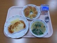 牛乳、カレーミートトースト、ジュリエンヌスープ、じゃがバター、りんごヨーグルト