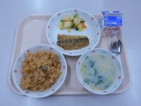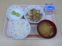 牛乳、ご飯、秋刀魚の筒焼き、切り干し大根の含め煮、利休汁、ぶどう(シャインマスカ...