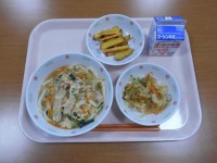 牛乳、かきたまうどん、和風サラダ、さつま芋のハニーレモンがらめ