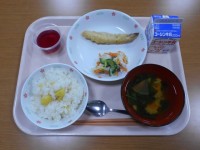 牛乳、栗ご飯、ししゃもの変わり天ぷら、野菜の梅風味、すまし汁、ぶどうゼリー