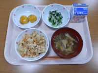 牛乳、ご飯、擬製豆腐、野菜のツナ和え、菊花入りすまし汁