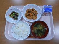 牛乳、ご飯、生揚げの甘酢煮、野菜のひじき和え、じゃがいものみそ汁