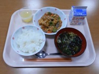 牛乳、ご飯、有機野菜と生揚げの甘酢煮、有機味噌のみそ汁、青森りんごゼリー