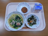 牛乳、ツナときのこの和風スパゲッティ、冬野菜サラダ、キャラメルポテト