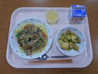 牛乳、しょうゆラーメン、じゃこサラダ、もちもちカレーポテト