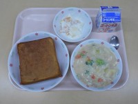 牛乳、きな粉トースト、豚肉と白菜のクリーム煮、フルーツヨーグルト