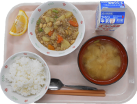 ご飯、新じゃがいものそぼろ煮、かぶのみそ汁、季節の柑橘