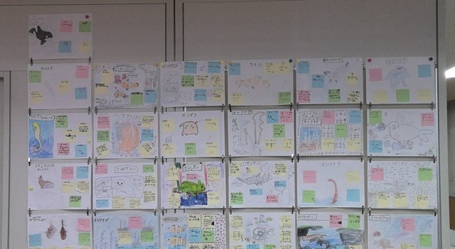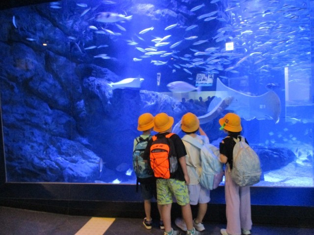 2年生の生活科見学は、水族館に行きました。いろいろな水中の生きものに興味津々で見学していました。「ゼリーのようなくらげがいたよ」「これがいせえびか。」などスイミーででてきた生きものとも重ね楽しんでいました。イルカショーでは、イルカ達に水しぶきのサービスをもらっていました。グループでの見学時間もルールを守って仲良くすごせていました。その後の生活科の学習では、見つけた生きものの中から1つ選び友達に発表することができました。