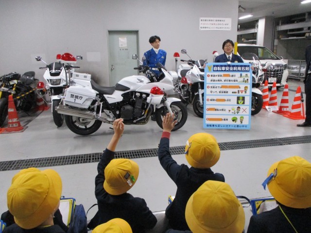 神田消防署では、消火器訓練を体験させていただきました。万世橋警察署では、パトロールカーや交通取締用自動二輪車(白バイ)に一人ずつ乗せていただきました。3年生は、どの施設でも興味深く話を聞いたり、積極的にインタビューをしたりする姿が見られました。