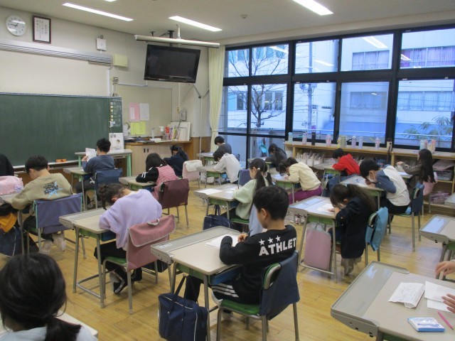 3学期になり初めに書き初め会をしました。12月に一文字ずつ形を確認し、冬休みにたくさん練習したことを作品に込めました。全員が集中し、教室内が物音一つ聞こえないほどでした。頑張って仕上げた作品を見る顔は、とても嬉しそうでした。