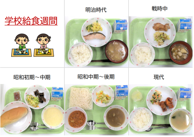 この期間の1月26日~1月30日までの1週間、給食の始まりである明治時代から現代の給食まで、時代ごとの給食を出しました。