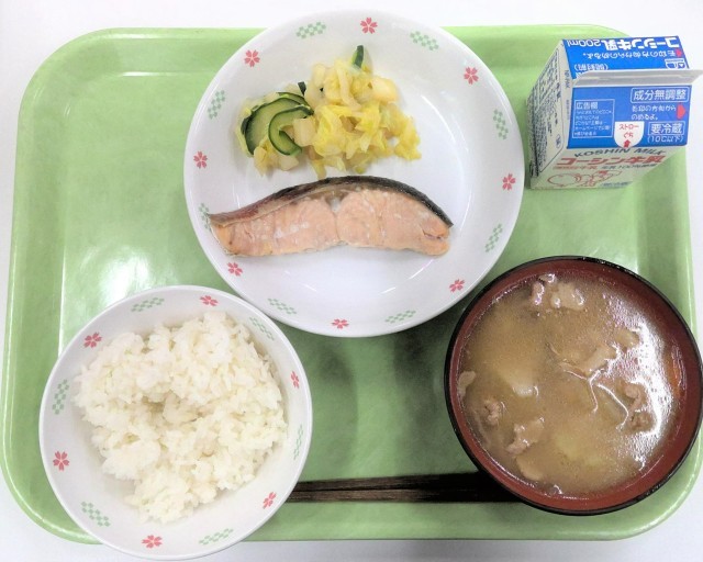 【明治時代】牛乳、ごはん、鮭の塩焼き、白菜の浅漬け、芋煮
