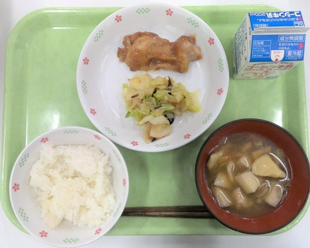 【戦時中】牛乳、ごはん、とり肉の梅風味焼き、野菜の塩昆布和え、すいとん
