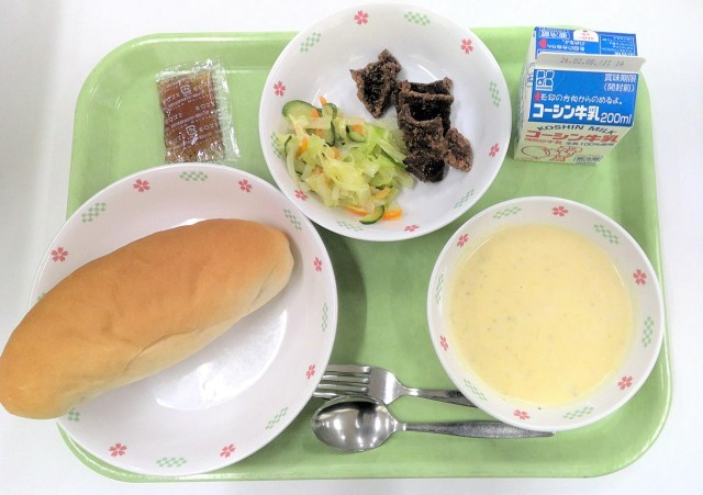 この時代によく出されていた「コッペパン」、「くじら」、「脱脂粉乳」を使ったメニューです。脱脂粉乳は、コーンスープに入れ、飲みやすく仕上げました。