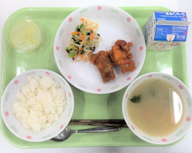【現代の給食】牛乳、ごはん、ヤンニョムチキン、塩ナムル、トックスープ、レモンスカッシュゼリー