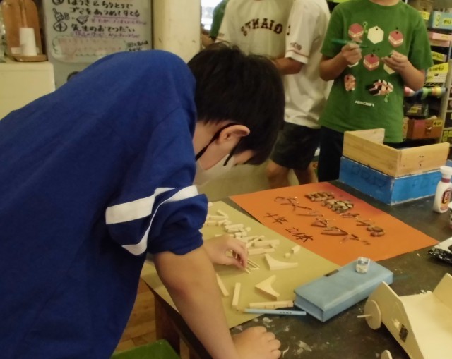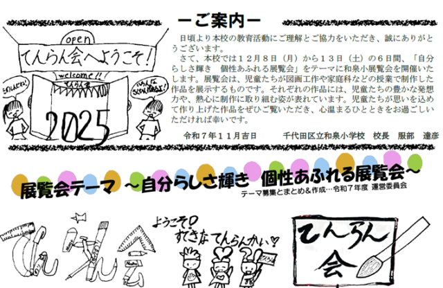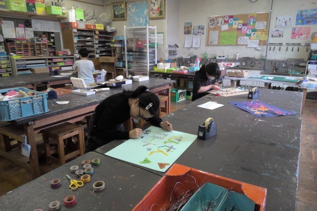 現在、12月の展覧会に向けて、有志での展覧会係の児童が、日々展覧会に向けての準備活動を進めています。展覧会のプログラムの挿絵や、題材名の看板づくりなどを朝や放課後に活動しています。