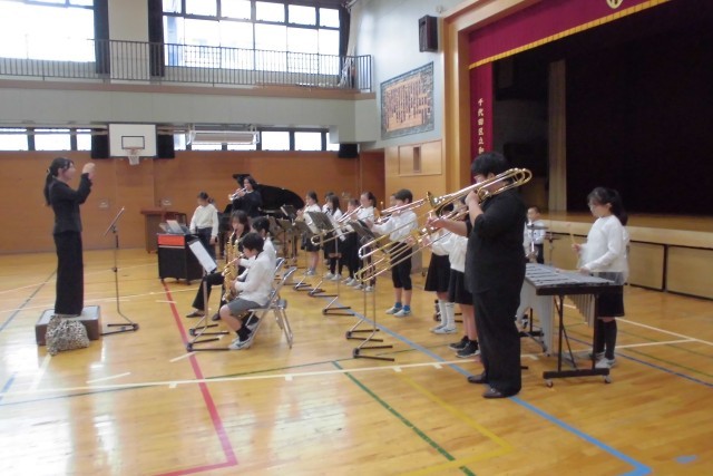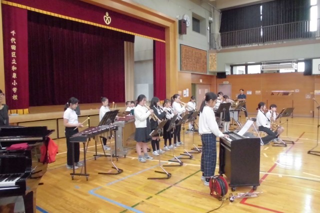 土曜授業後、午後に教職員と地域の方々が参加しての懇親会「和泉小バースデイ会」が体育館にて執り行われました。歴代のPTA役員や町会関係者の皆様、職員に見守られながら、本校「ビックバンド」の演奏が披露されました。今年度所属している18名の児童により「きらきら星」と「ミッキーマウスマーチ」が披露されました。これまでの練習の成果を発揮し、素敵な音色が体育館内に響き渡っていました。