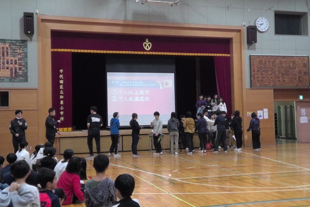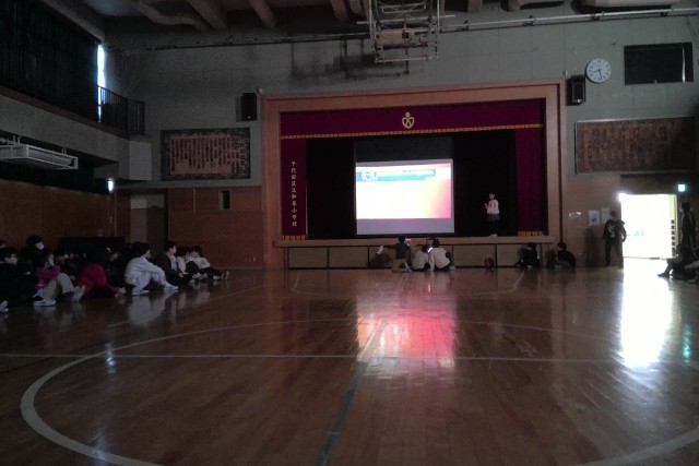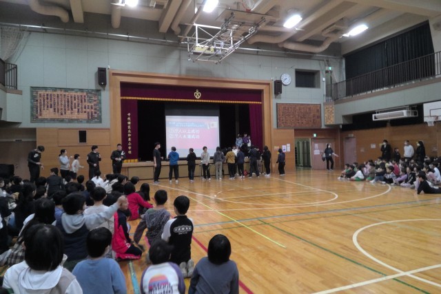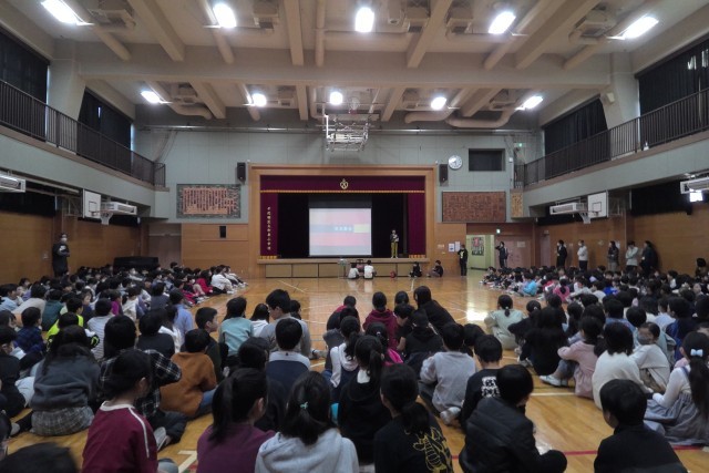 2学期最後の児童集会が体育館で行われました。音楽の曲あてクイズと共に、先生方がけん玉を何回まで連続で続けられるかなど、児童が盛り上がる企画で楽しく今年最後の集会を終えました。