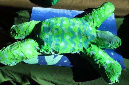 学校の教室や廊下、体育館などお気に入りの場所を決めて、そこに「いたらいいなぁ」という生き物を考えてつくりました。現実にはいない、不思議な生き物たちです。苦労しながらも、頑張ってつくりました!