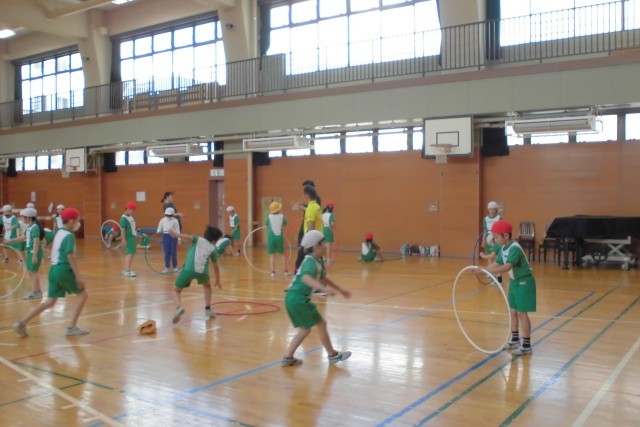 5月に入り、コオディネーショントレーニングが始まりました。コオディネーショントレーニングとは、体の各部位を協調して動かすことで、運動能力を向上させるトレーニングのことです。脳と神経の回路を作り、運動神経を鍛えることで、身体をスムーズに動かせるようになります。特に、子どもの運動能力向上に有効とされています。3年生はフラフープを使った運動を体育館で楽しく行っていました。
